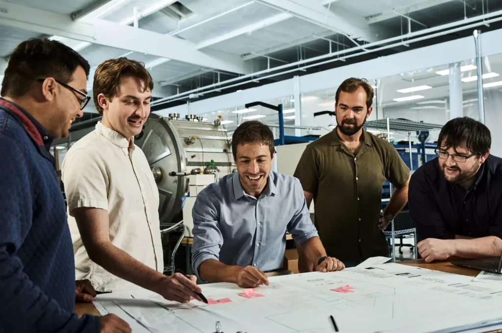 Ekipa Apexa pregleduje načrte svoje prve tovarne. Od leve: vodja storitev za področje odprav Nirav Mehta, vodja prodaje Andrew Berg, glavni direktor Ian Cinnamon, tehnični direktor Max Benassi in vodja proizvodnje Alex Verrelli. (Foto: Ethan Pines/FORBES)