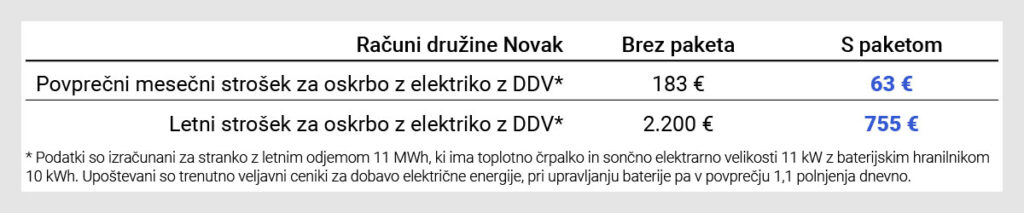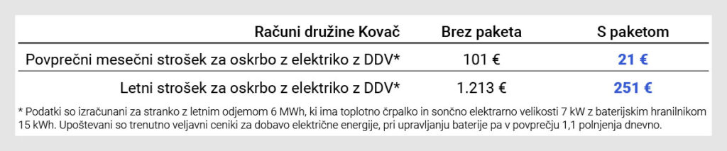 Družina Kovač živi v nizkoenergijski hiši in letno porabi približno 6.000 kWh elektrike, pri čemer za ogrevanje uporabljajo toplotno črpalko. Pred odločitvijo za paket Pametna samooskrba so za elektriko plačevali 1.213 € na leto. Danes, zahvaljujoč lastni sončni elektrarni in naprednemu upravljanju baterijskega hranilnika, znaša njihov letni strošek le še 251 € – to pomeni kar 962 € letnega prihranka oziroma 79 % nižji strošek za elektriko.