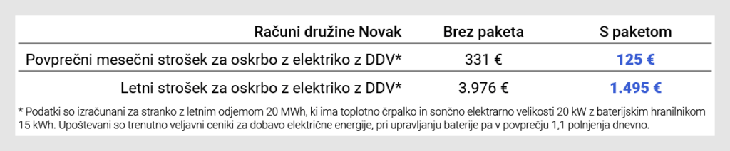 Vsem trem družinam stroške znižuje napreden paket Pametna samooskrba, ki stranki zagotavlja najvišje prihranke iz treh virov – energije proizvedene iz sončne elektrarne, odkupa presežno proizvedene elektrike in fiksnega mesečnega popusta za upravljanje hranilnika energije v vseh letnih časih.