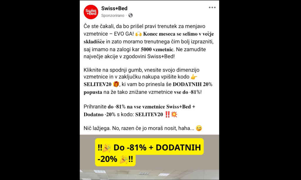 Bralka, s katero smo govorili, a ne želi biti imenovana, je ena od tistih, ki so imeli s negativno izkušnjo s trgovcem. Kot pravi, sta s partnerjem iskala vzmetnico in naletela na oglas znake Swiss+Bed, ki je obljubljal izdelek po močno znižani ceni. Znižanje s tisoč na 400 evrov ju je premamilo, tako da sta izdelek tudi kupila.